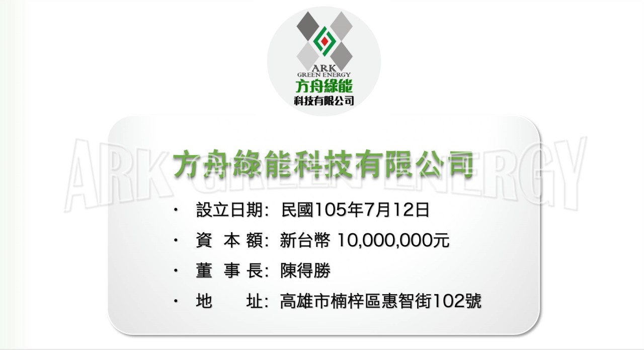 方舟綠能有限公司成立於民國105年。 主要從事太陽能發電等再生能源之設備設計與系統整合等。